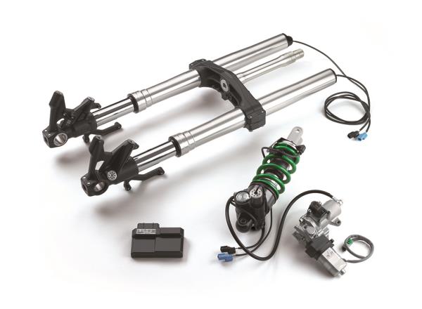 Suspension front ø43 mm inverted fork with KECS-controlled rebound and compression damping, manual spring preload adjustability, and top-out springs