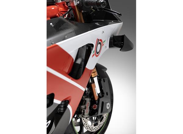 At the rear is Showa's Balance Free Rear Cushion (BFRC) lite rear shock, which was featured on Kawasaki’s superbikes that won seven titles in WorldSBK. bimota’s design philosophy guided the decision to mount the shock vertically rather than horizontally to achieve the ideal on-track performance. The shock’s placement combined with machined billet aluminium parts confer bimota-original looks and performance to the KB998 Rimini’s rear end.